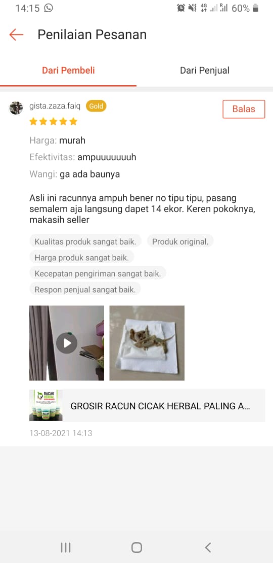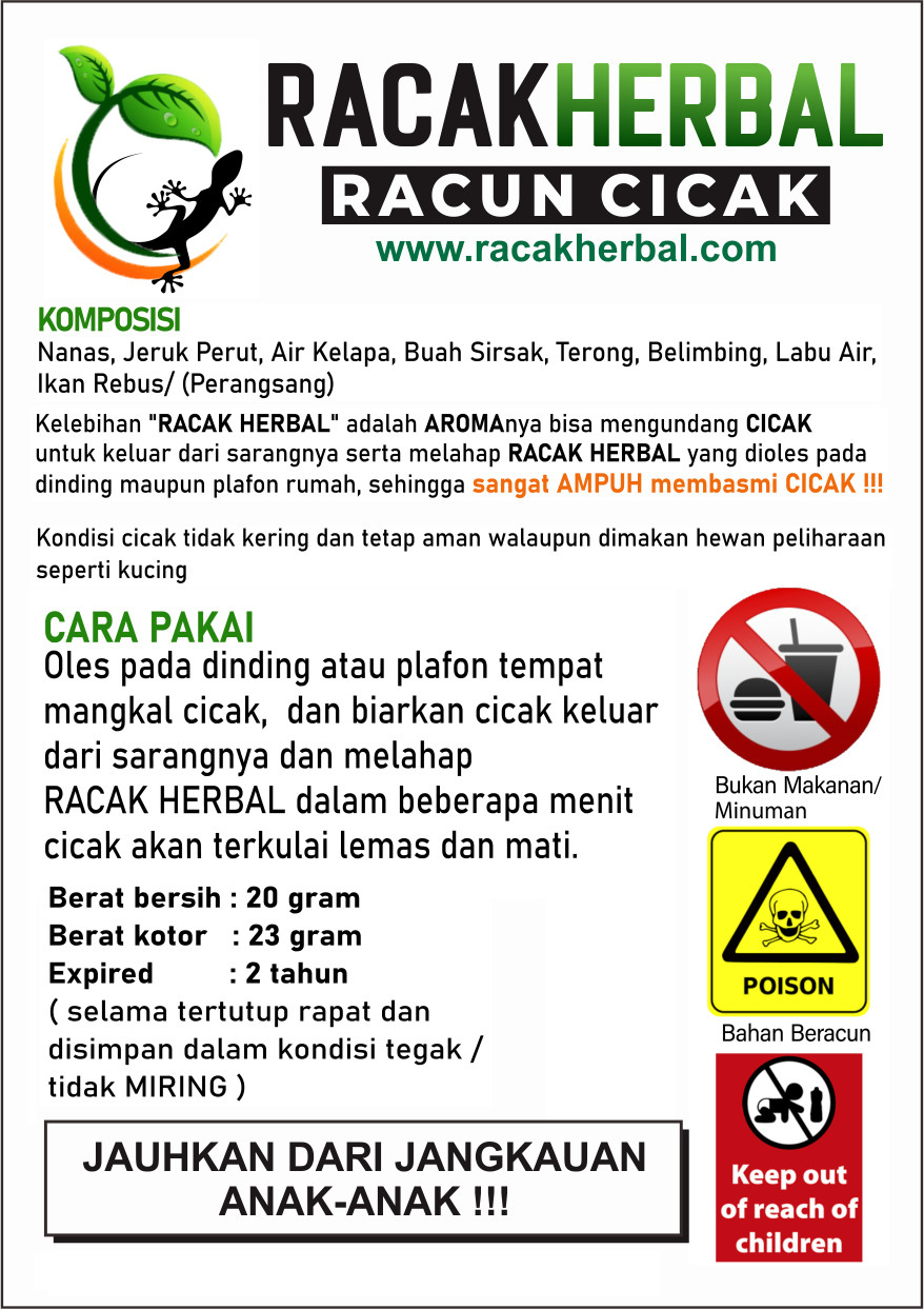 Kelebihan "Racak Herbal" adalah AROMAnya yang bisa mengundang cicak keluar dari sarangnya serta melahap Racak Herbal yang dioles pada dinding maupun plafon rumah sehingga Sangat AMPUH membasmi CICAK!!